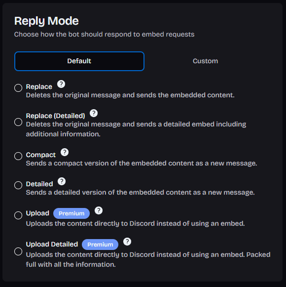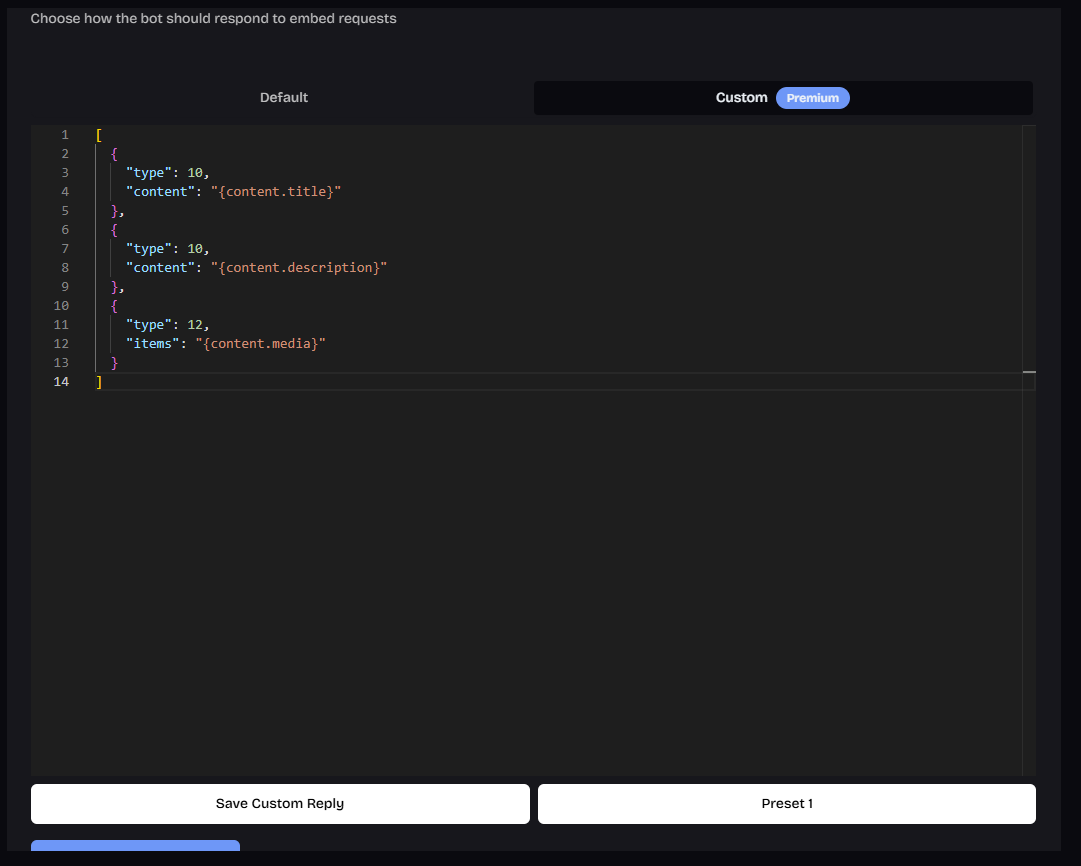 Embed EZ now supports Custom Reply Mode, allowing premium users to define their own embed formats for social media links using Discord components. Configure responses through the dashboard with variables like media, title, and statistics.